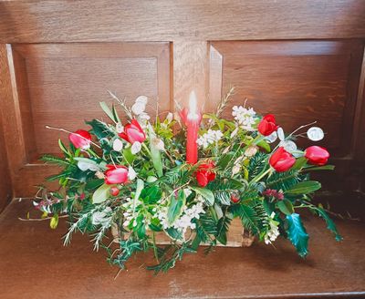 Christmas/winter table centrepieces in vintage wooden brick moulds (which have the old makers' marks in the bottom) with sustainable mechanics as the base , filled with seasonal British flowers including tulips , extra special festive foliage cut from the park and a central tapered candle. Red or white colourways available.